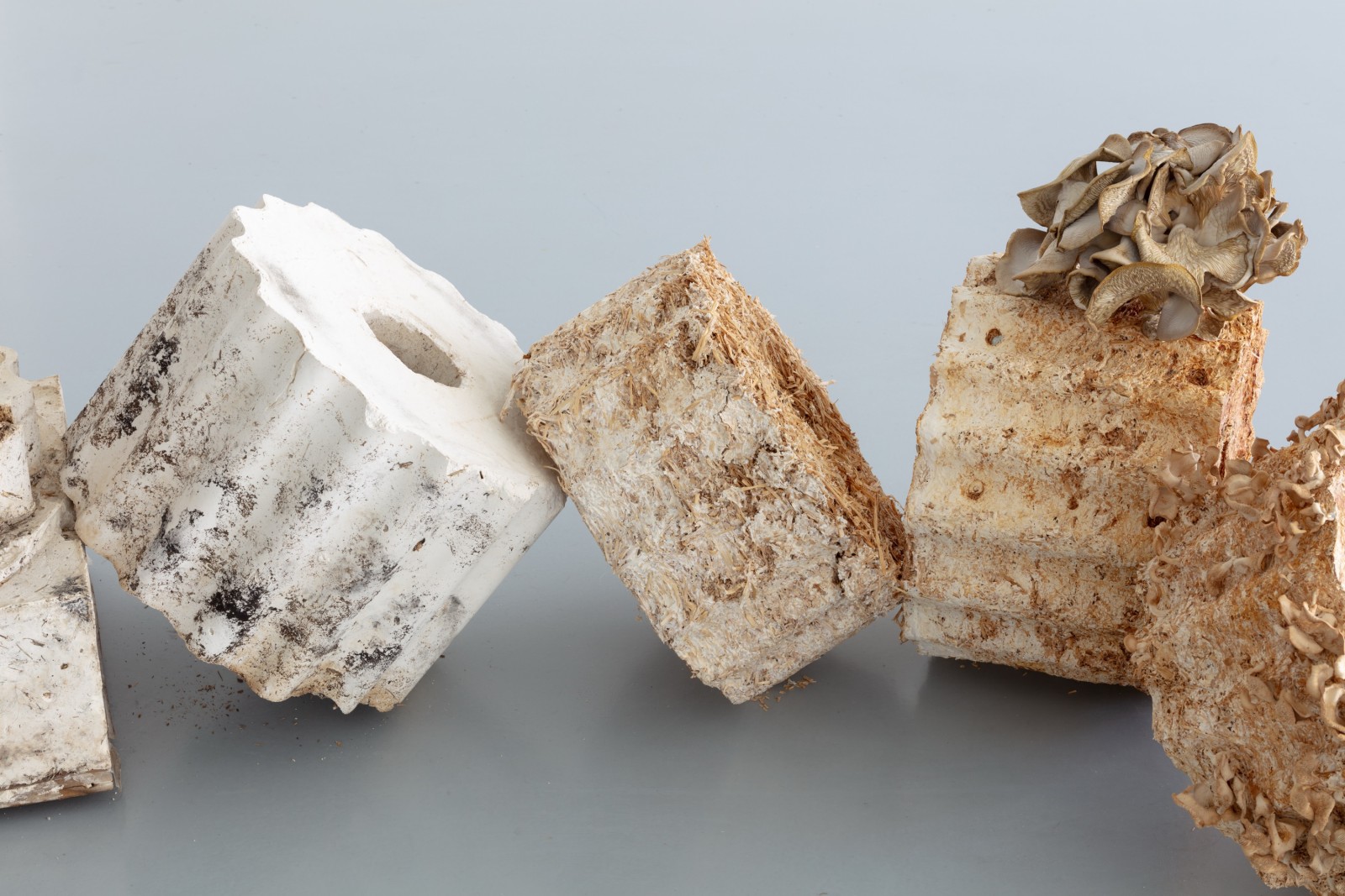 Que nous dit le cycle de vie du mycélium — solidification, fructification, dessèchement, décomposition — sur l’acte de construire et l’art de vivre ? S’agit-il d’un matériau qui se forme avec le temps, nécessitant un geste précis de moulage et de démoulage ? Pourrait-il donner naissance à un nouvel artisanat, sensible aux rythmes du vivant, à la dégradation et au renouveau — transformant ainsi notre « environnement construit » ?