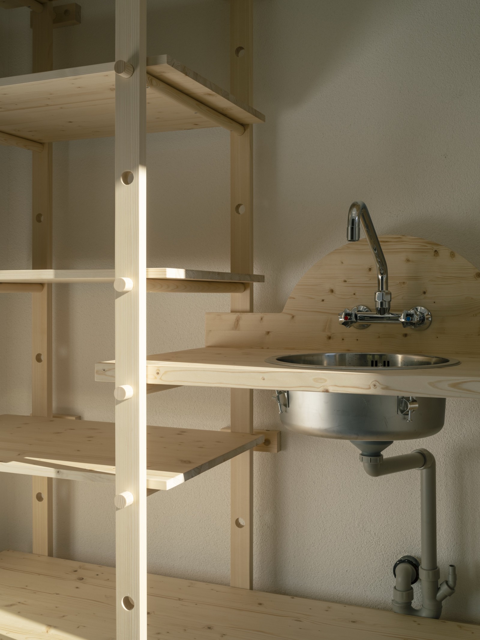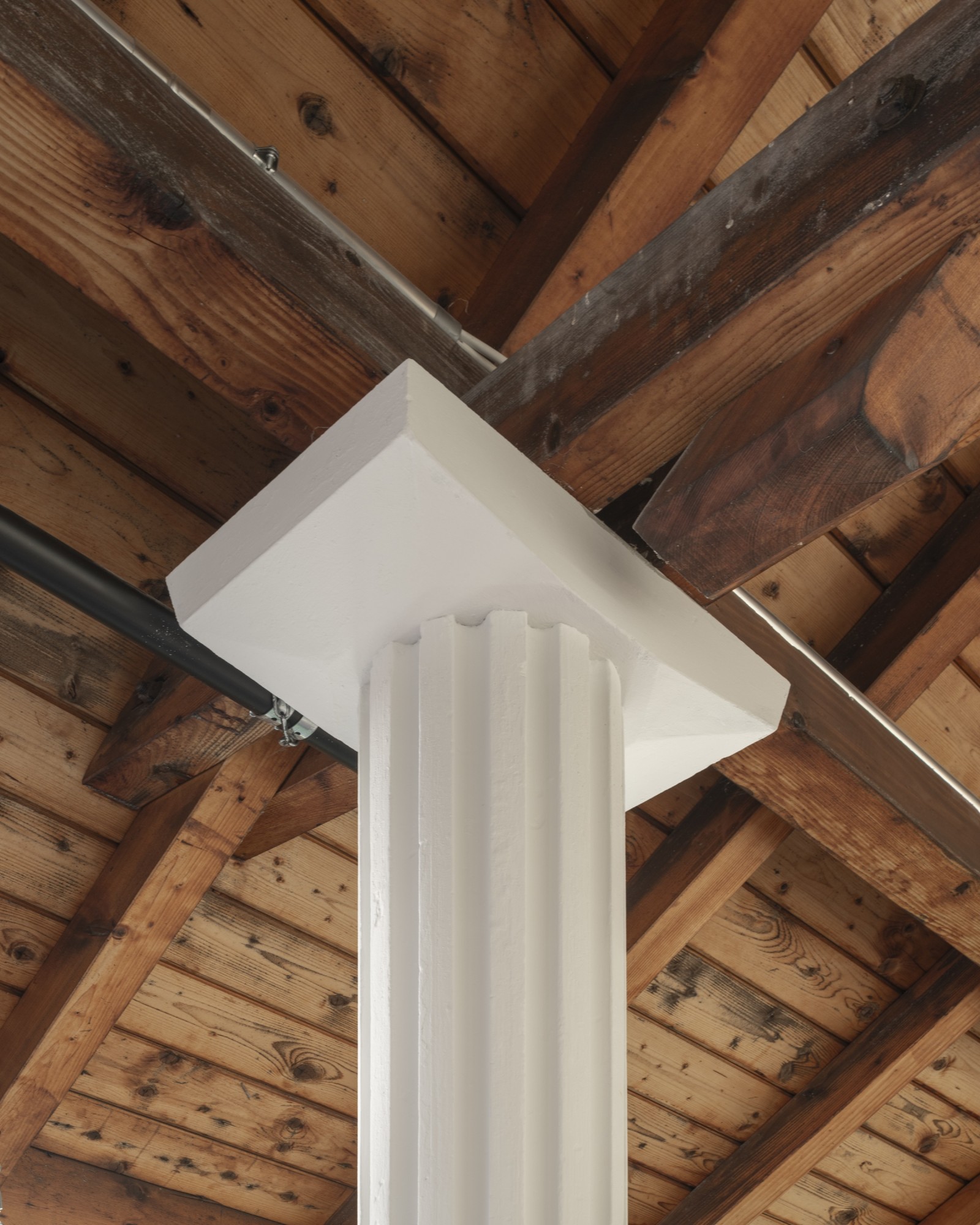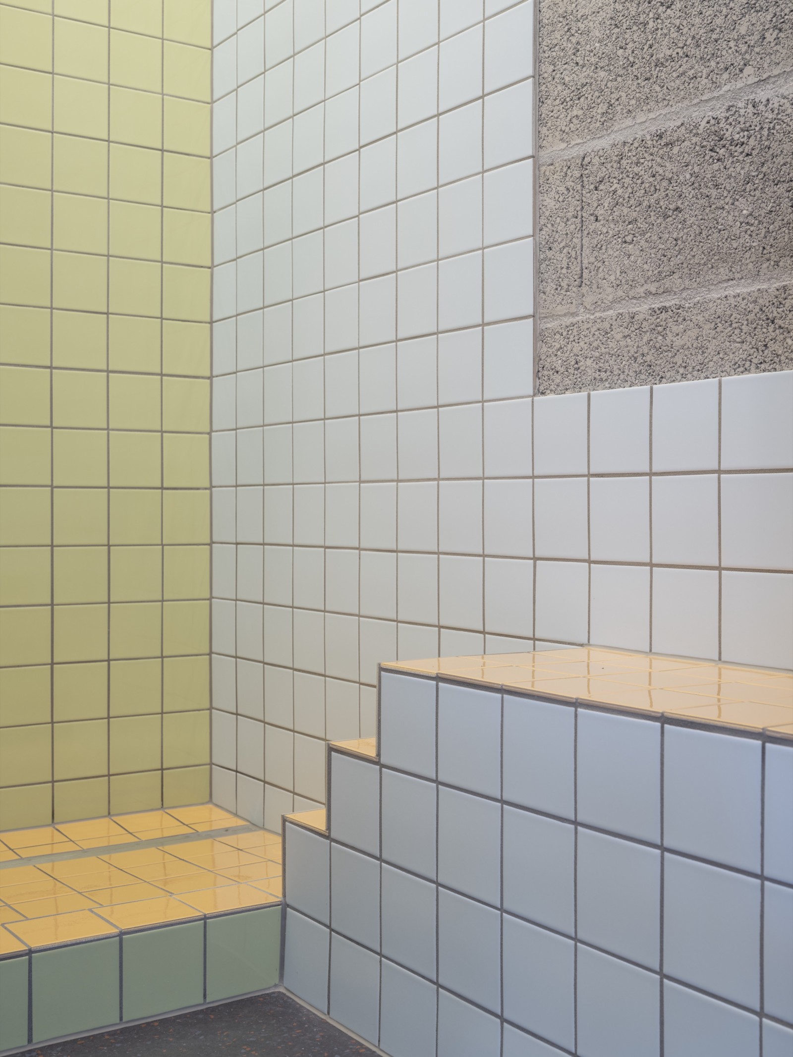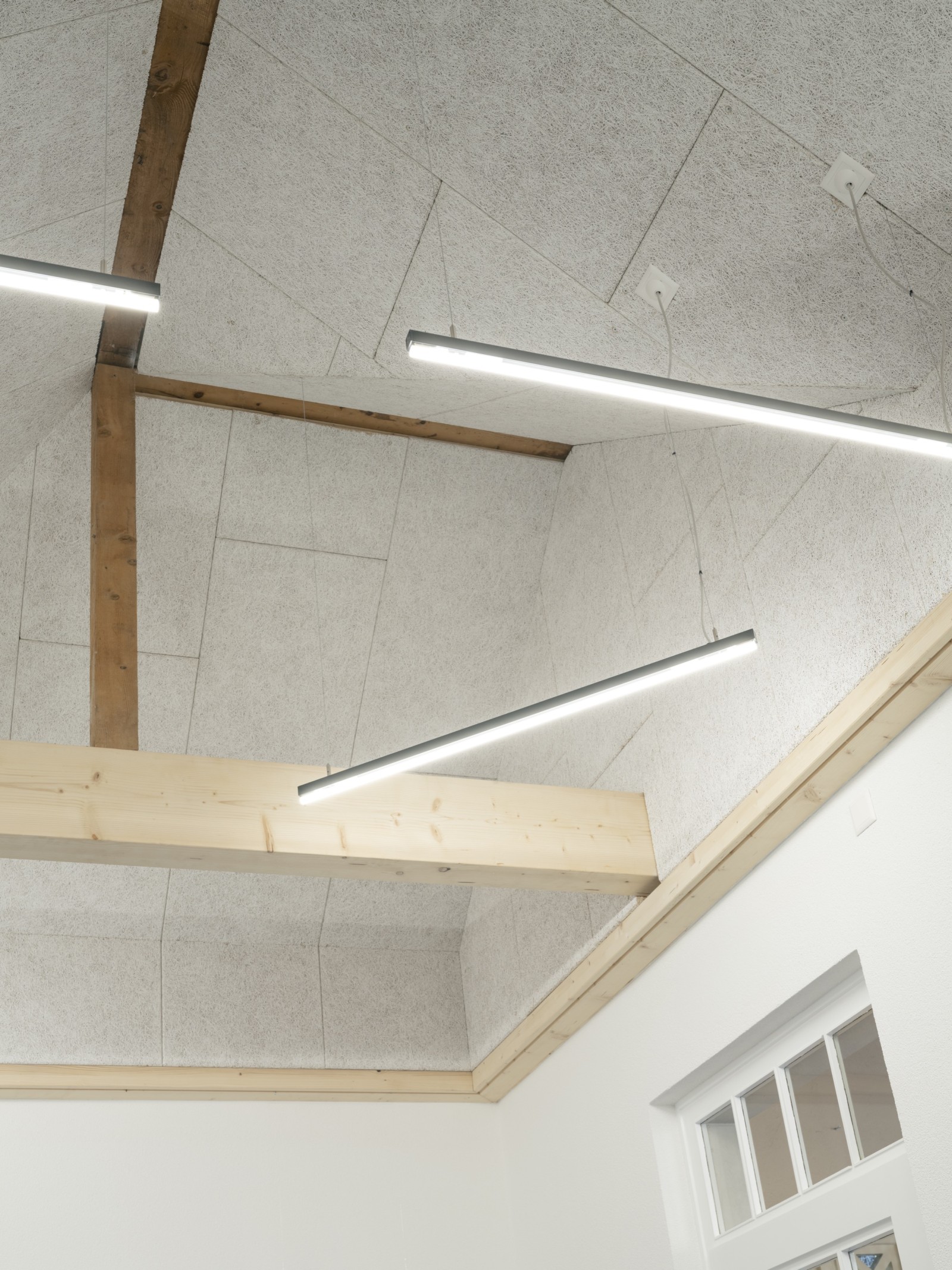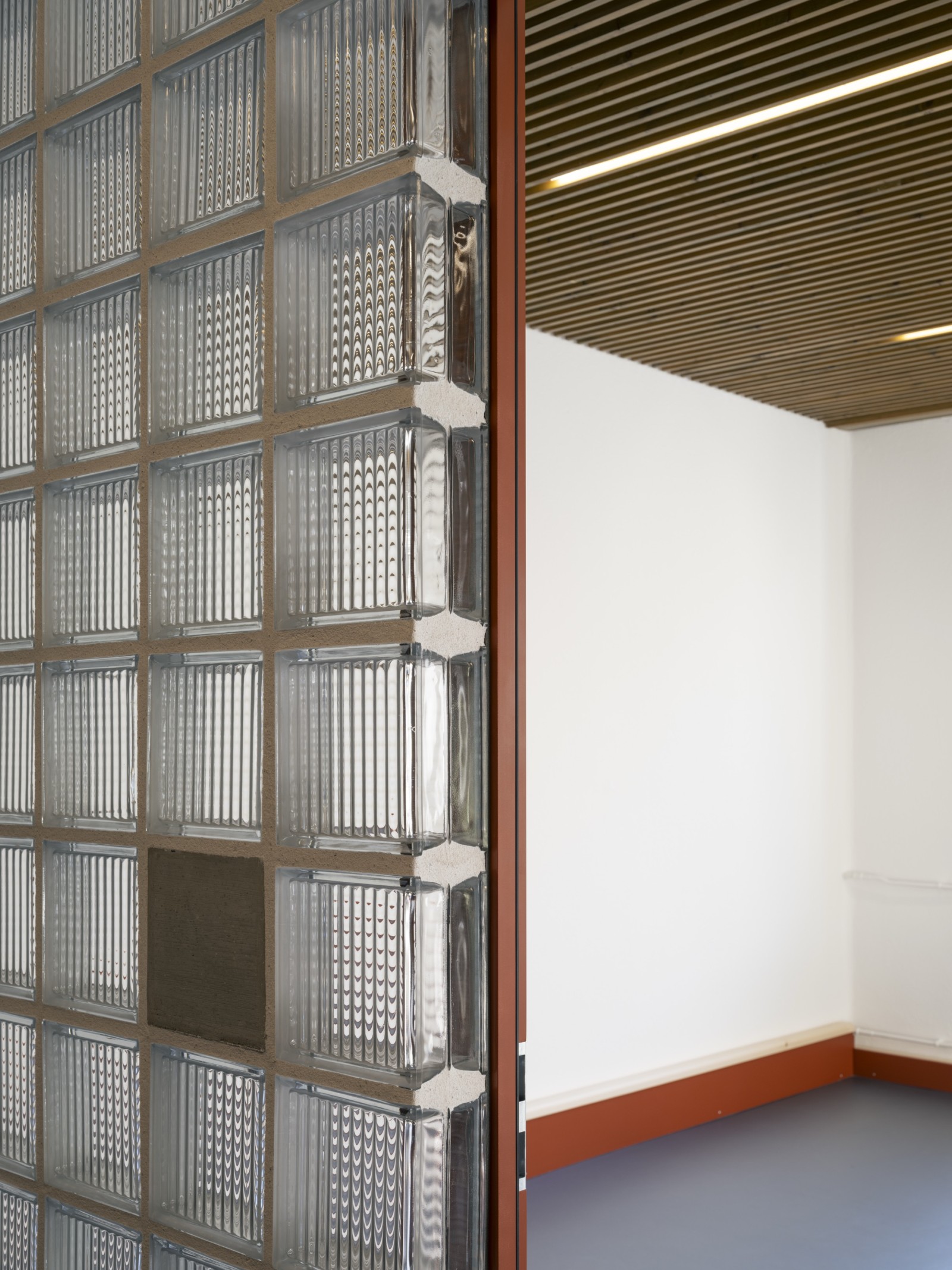 L’intervention architecturale se veut à la fois délicate et radicale, révélée comme une série d’éléments ajoutés ou retirés avec précision. Le démontage de certaines structures permet de décloisonner les espaces, d’augmenter les hauteurs sous plafond et de mettre à jour les structures brutes existantes. Les nouveaux éléments construits se distinguent de l’existant par leur forme et leur matérialité : mur en plot de ciment, meuble et plinthe en épicéa massif, sol en granulés de caoutchouc mélangés à des copeaux de bois de châtaignier du domaine. L’ensemble s’inspire largement des archives photographiques retrouvées sur le site. Ainsi, faïences émaillées, miroirs, plots de verre et globes lumineux font leur réapparition. Les radiateurs, équipements sanitaires et autres éléments utiles sont réemployés, dans une logique de réutilisation consciente. La couleur rouge appliquée aux plinthes et éléments métalliques est également issue de l’identité historique du lieu.